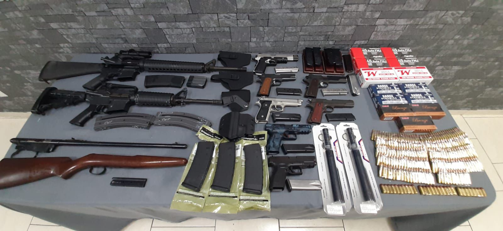 Al ordenarle detenerse y hacerle una inspección, las autoridades aseguraron 7 armas cortas, 3 armas largas, 17 cargadores, mil 168 cartuchos de diferentes calibres y otros objetos.