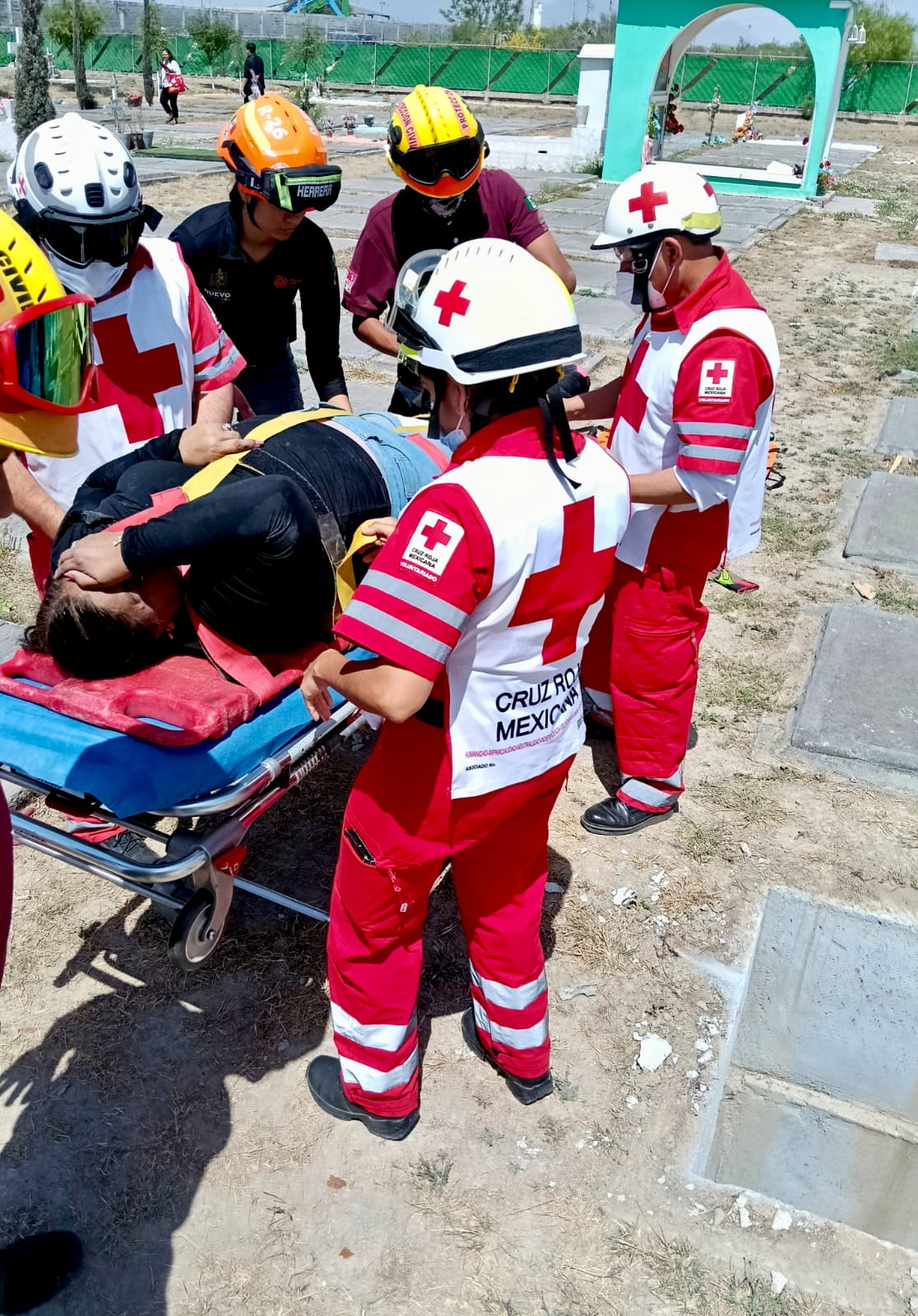 Elementos de Protección Civil como también paramédicos de la Cruz Roja llegaron al panteón ubicado en el cruce de las calles José María Caballero y Eduardo Caballero, donde encontraron a la lesionada a 2 metros de profundidad.