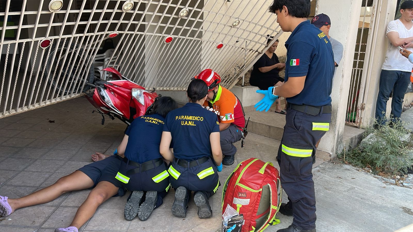 Monterrey, NL.- Tras perder el control de su motocicleta, una mujer quedó herida luego de que chocara y derribara el barandal de una casa en la Colonia Balcones de Alta Vista.