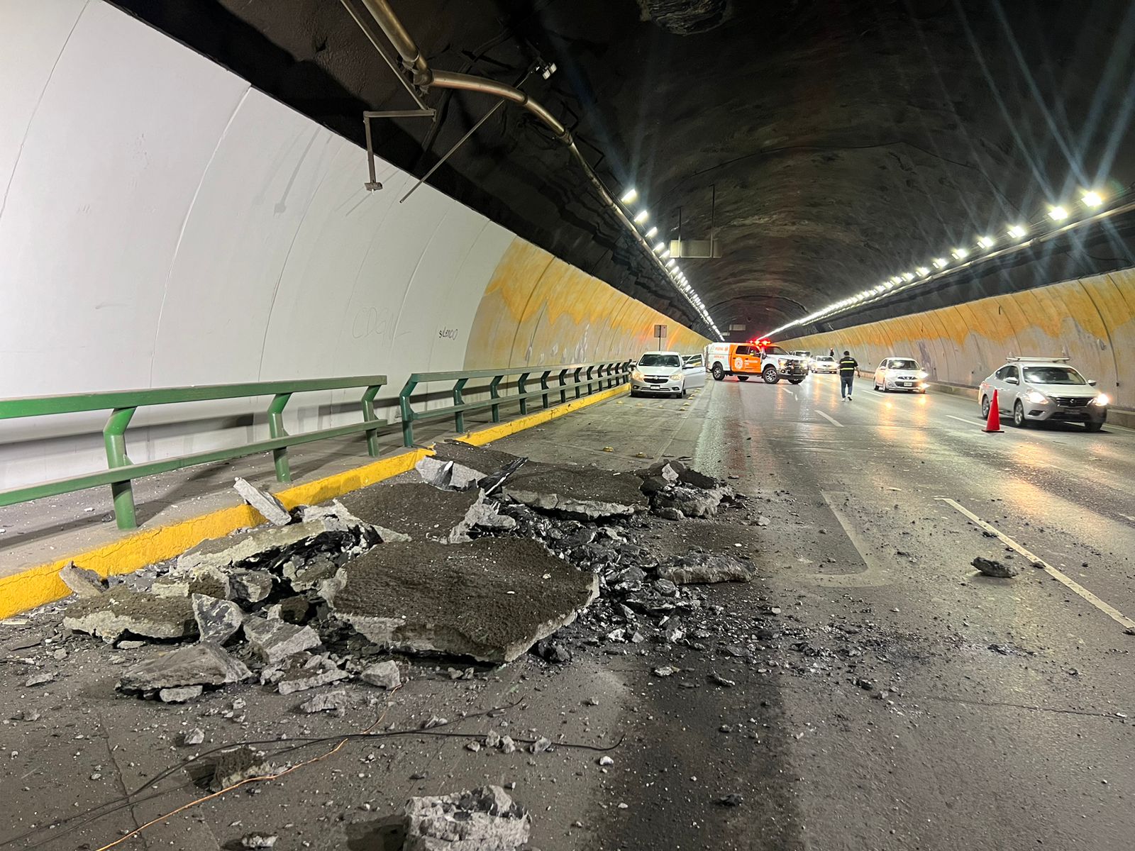 Monterrey, NL.- La caída de dos partes del techo del túnel de la Loma Larga generaron el cierre de carriles y caos vial.