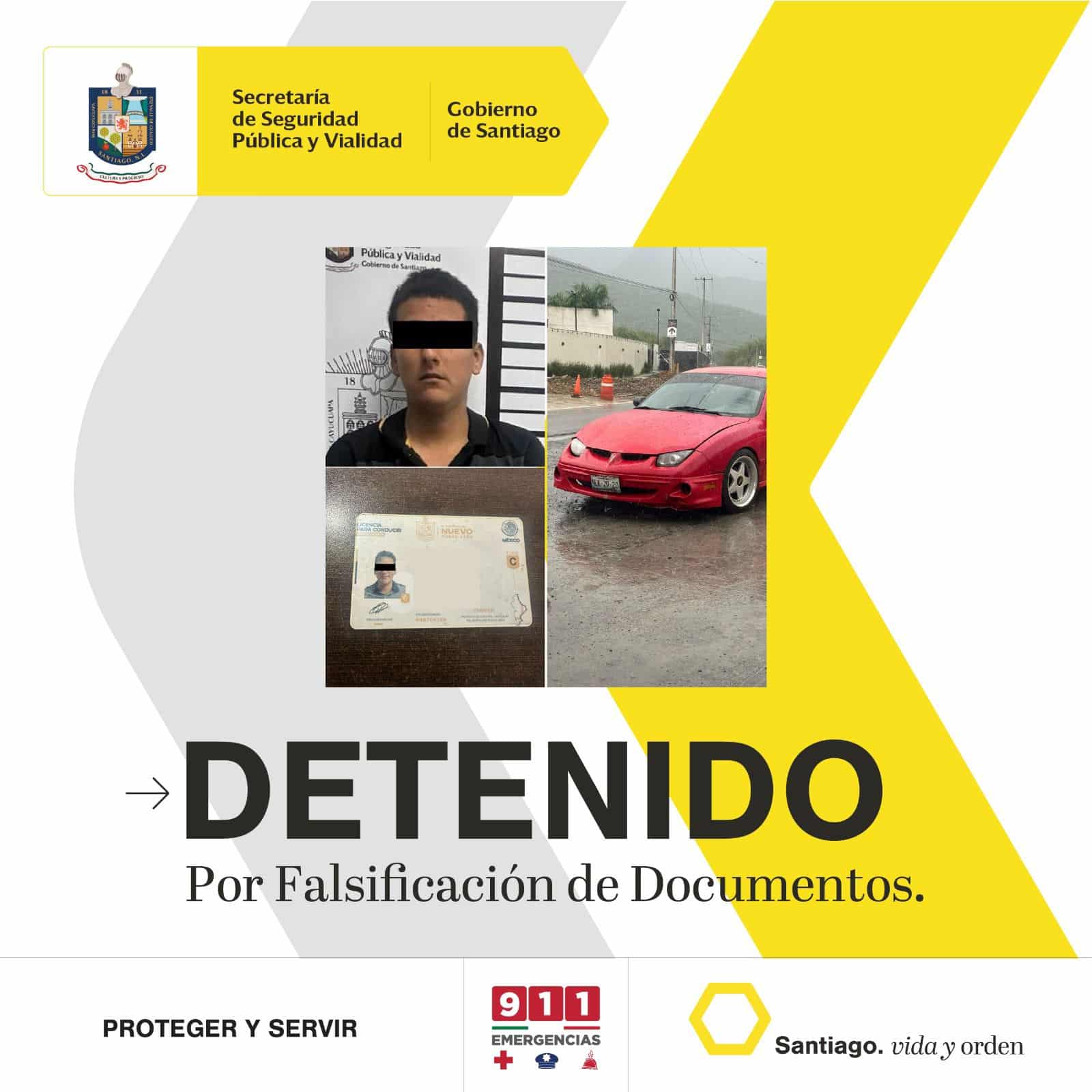Santiago, NL.- Un hombre de 31 años fue detenido por la Secretaría de Seguridad Pública y Vialidad, después de que se descubriera que su licencia de conducir era aparentemente falsa. La detención ocurrió luego de que el sujeto se viera involucrado en un accidente automovilístico.