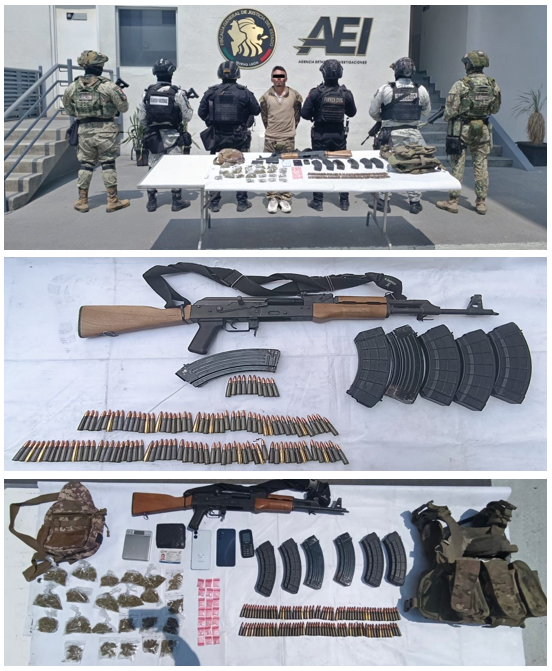Posteriormente al hacer una revisión, los uniformados aseguraron un arma larga abastecida con 10 balas, 5 cartuchos para arma larga abastecida con 107 balas, un chaleco balístico, 23 envoltorios con marihuana, 21 más con cristal, una báscula digital y 3 celulares.