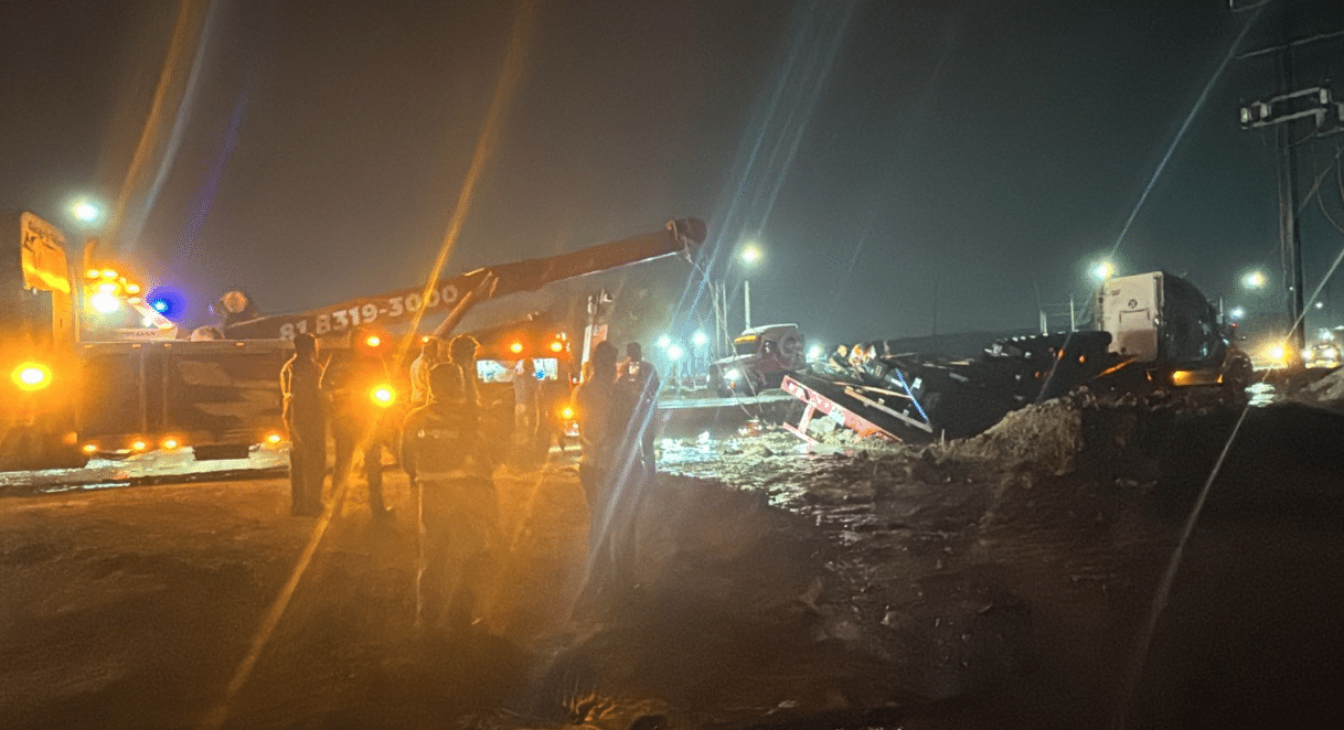 Al evadir una caseta de cobro del Periférico a través de una brecha, terminó cayendo sobre una de nuestras líneas de agua potable donde se realizan adecuaciones, justo en la bajada del puente que se está ampliando en la Carretera Apodaca – Agua Fría.