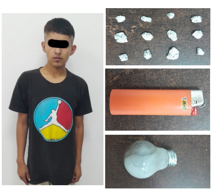 Ante esto el joven identificado como Gustavo Alberto tomó una actitud violenta contra los policías, quienes lo detuvieron de inmediato y le hicieron una revisión dando como resultado el aseguramiento de una bolsa con droga por lo que tras su detención quedó a disposición del Ministerio Público.