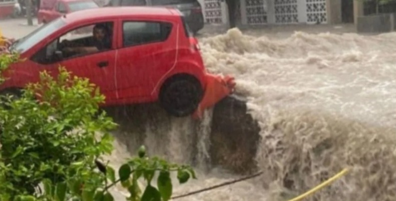 Monterrey, NL.- El conductor de un vehículo compacto fue salvado por elementos de Protección Civil de Monterrey luego de que quedara atrapado en medio de la corriente en calles de la Colonia Francisco Villa.