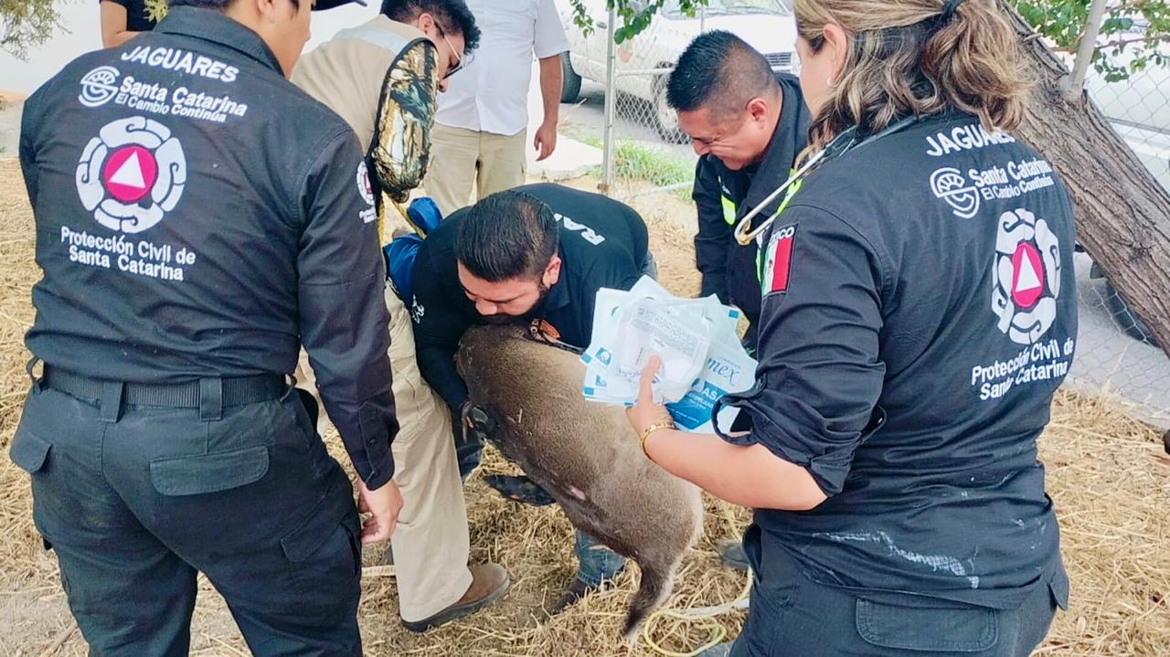 Elementos de Protección Civil de Santa Catarina rescataron a un venado, que fue localizado merodeando en la parte trasera de una empresa, ubicada en la colonia Fraccionamiento El Obrero.