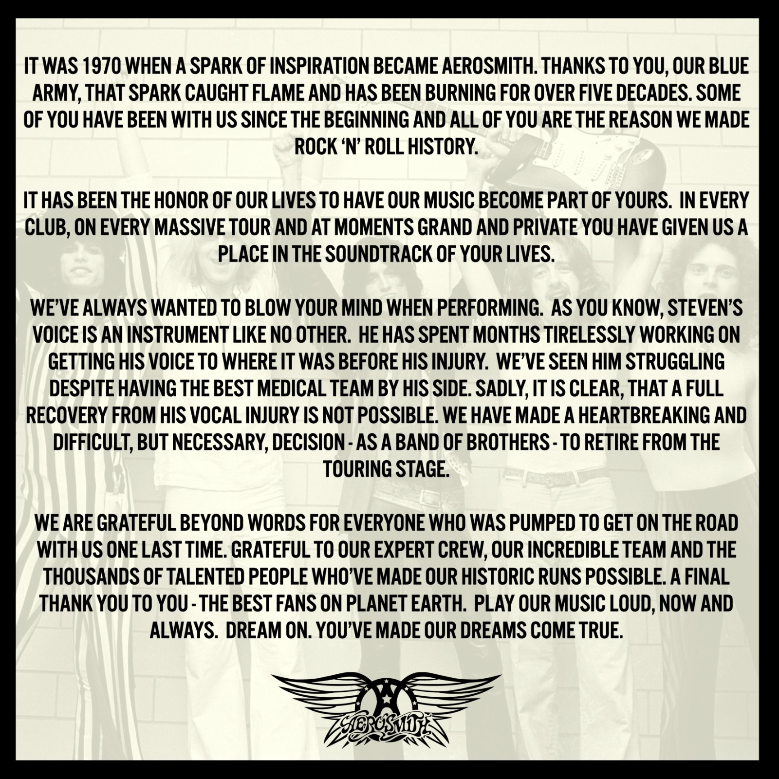 Mediante un comunicado la agrupación detalló que esta decisión no fue nada fácil y es debido a que el vocalista Steven Tyler no se a podido recuperar de la lesión que presenta en las cuerdas vocales.